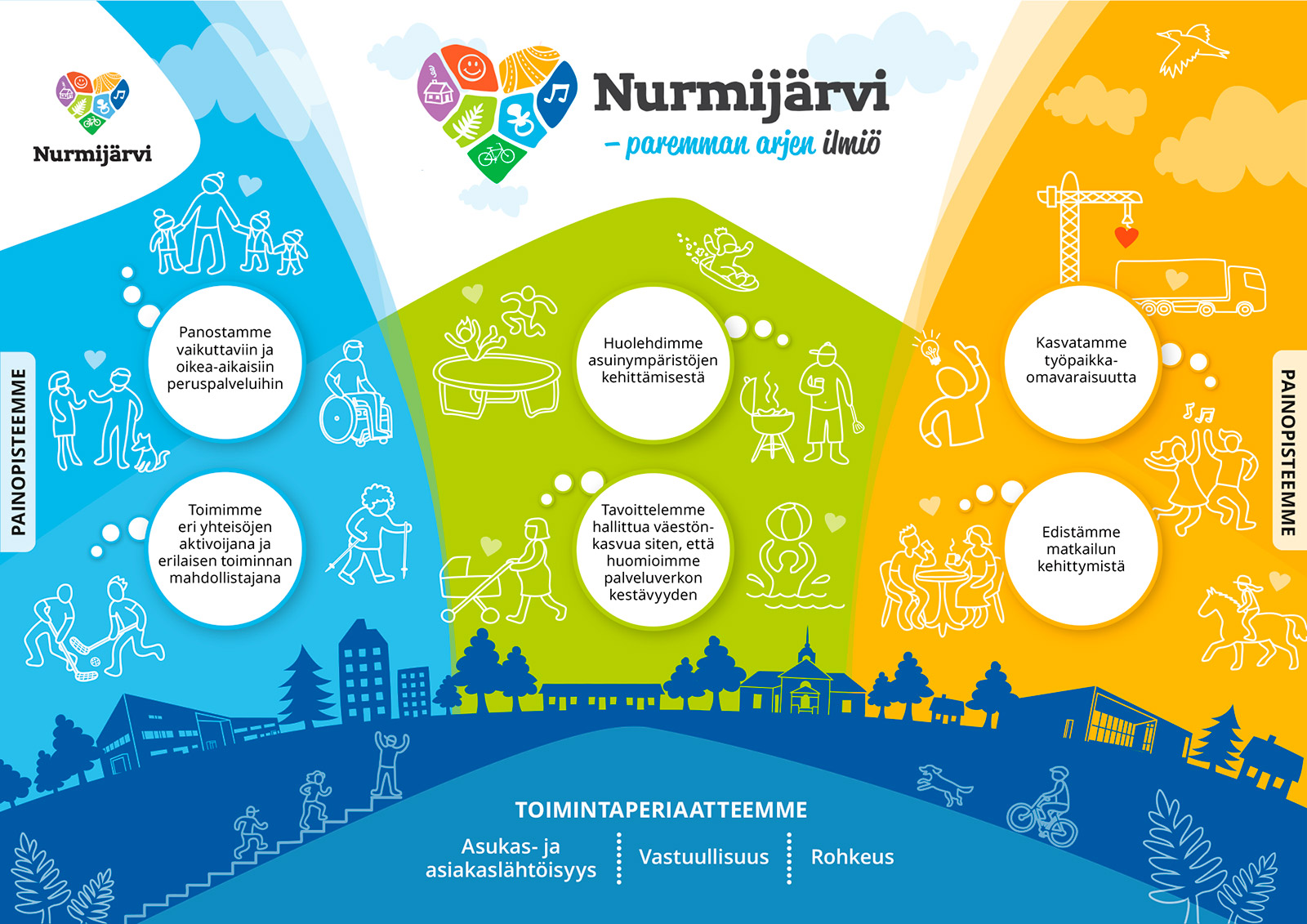 Nurmijärven tekemisen tapa ja henki – eli ns. ”talon tavat” määritellään toimintaperiaatteissamme. Ne näkyvät kulttuurissamme ja tekemisessämme päivittäin ja kertovat siitä, mille periaatteille toiminta, päätökset ja kehitys rakentuvat.